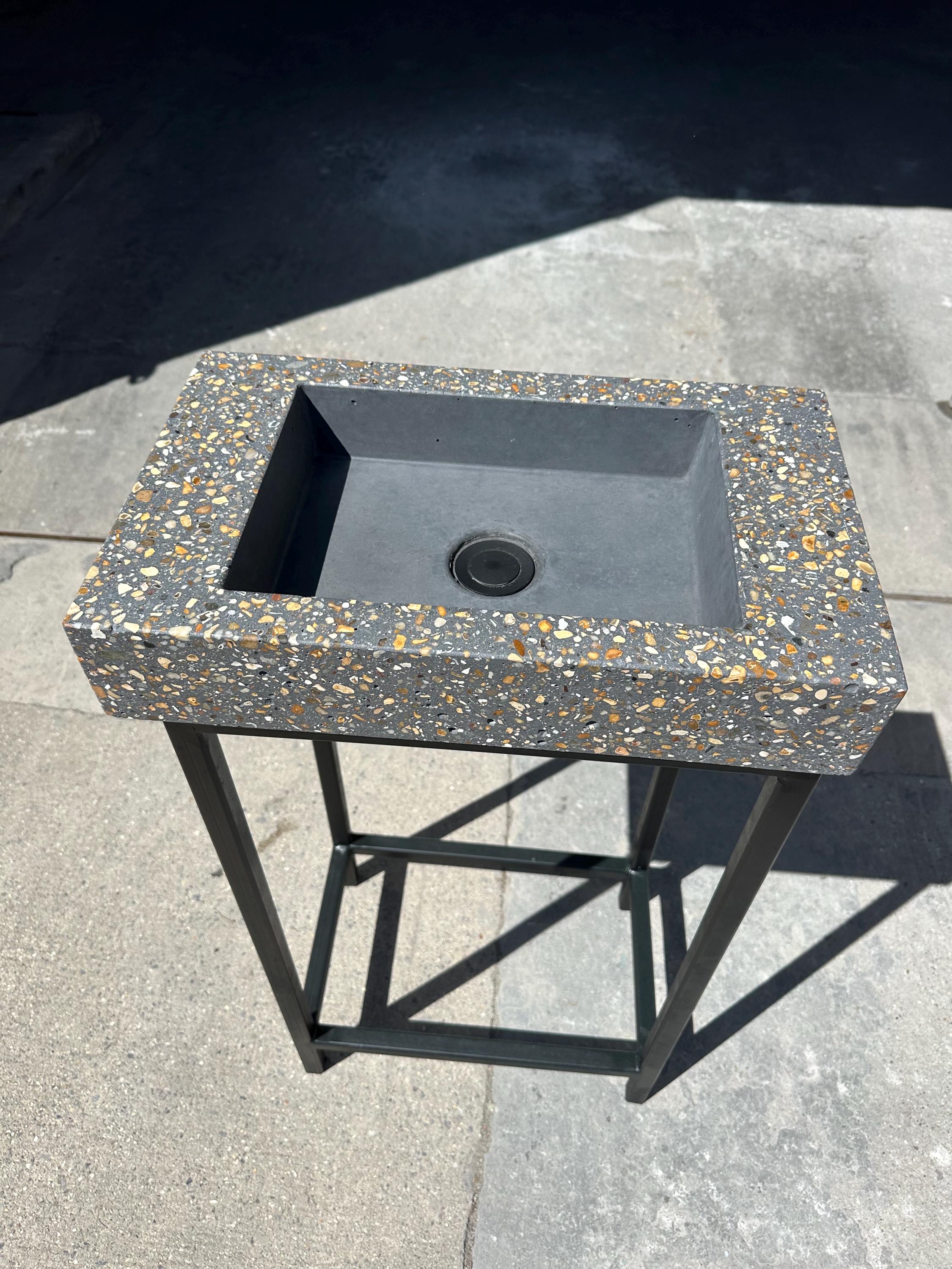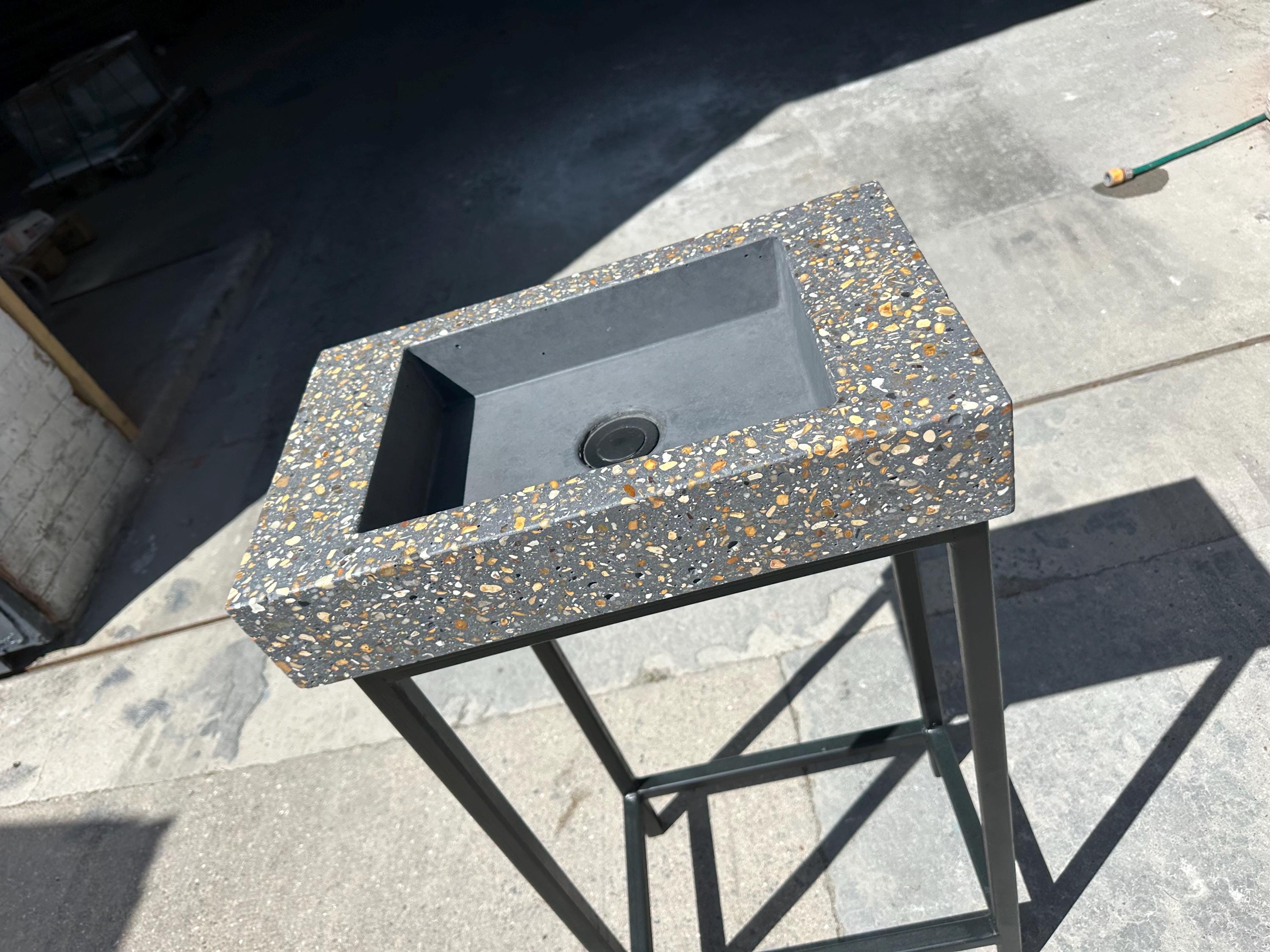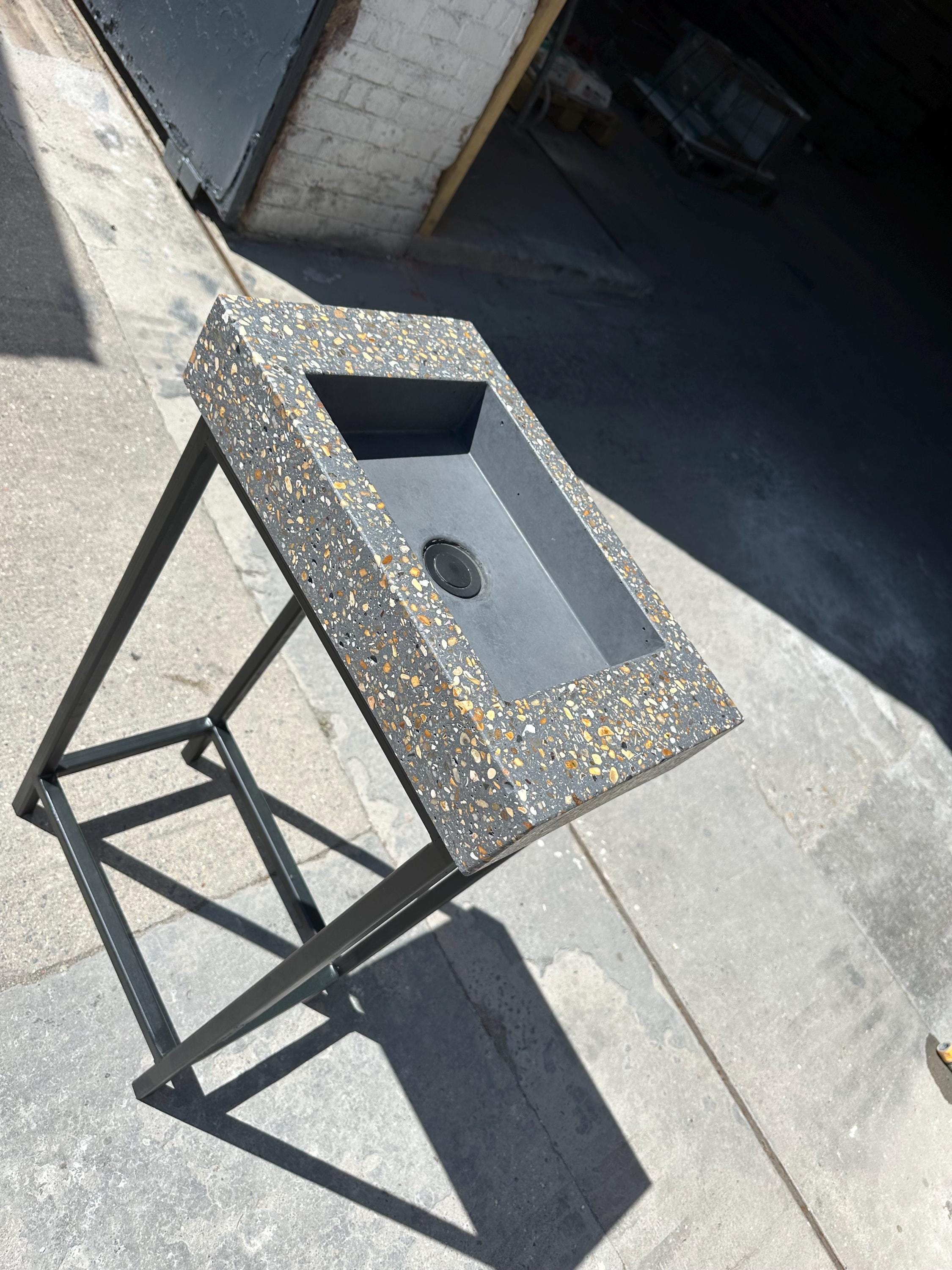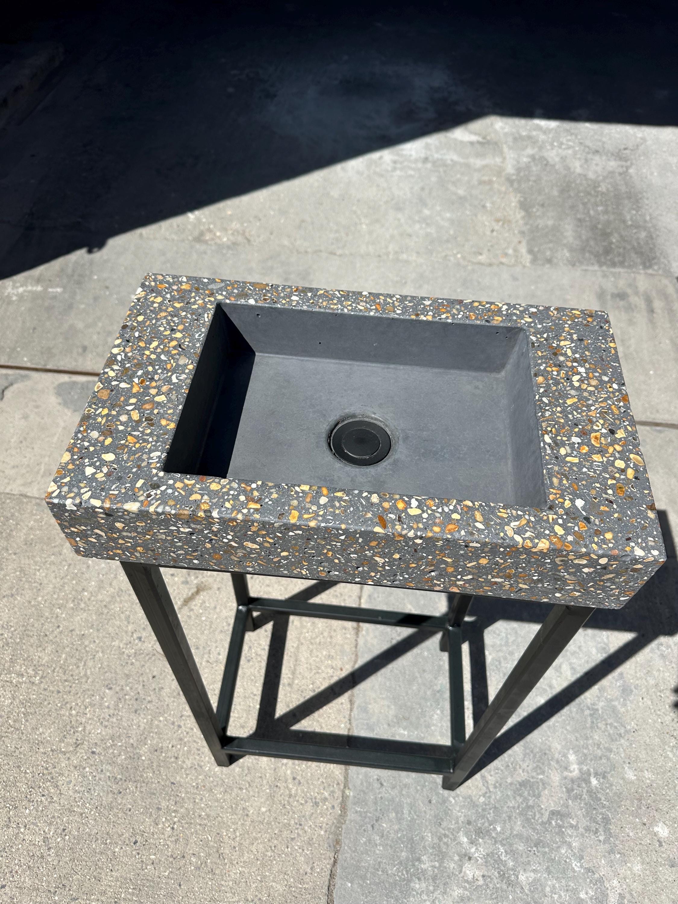 Make a bold statement in your bathroom with our handmade black terrazzo concrete sink and frame set, combining luxury design with everyday practicality. The deep black concrete basin is enhanced with natural terrazzo stone chips, creating a striking speckled finish that brings depth, texture, and style to any space.
