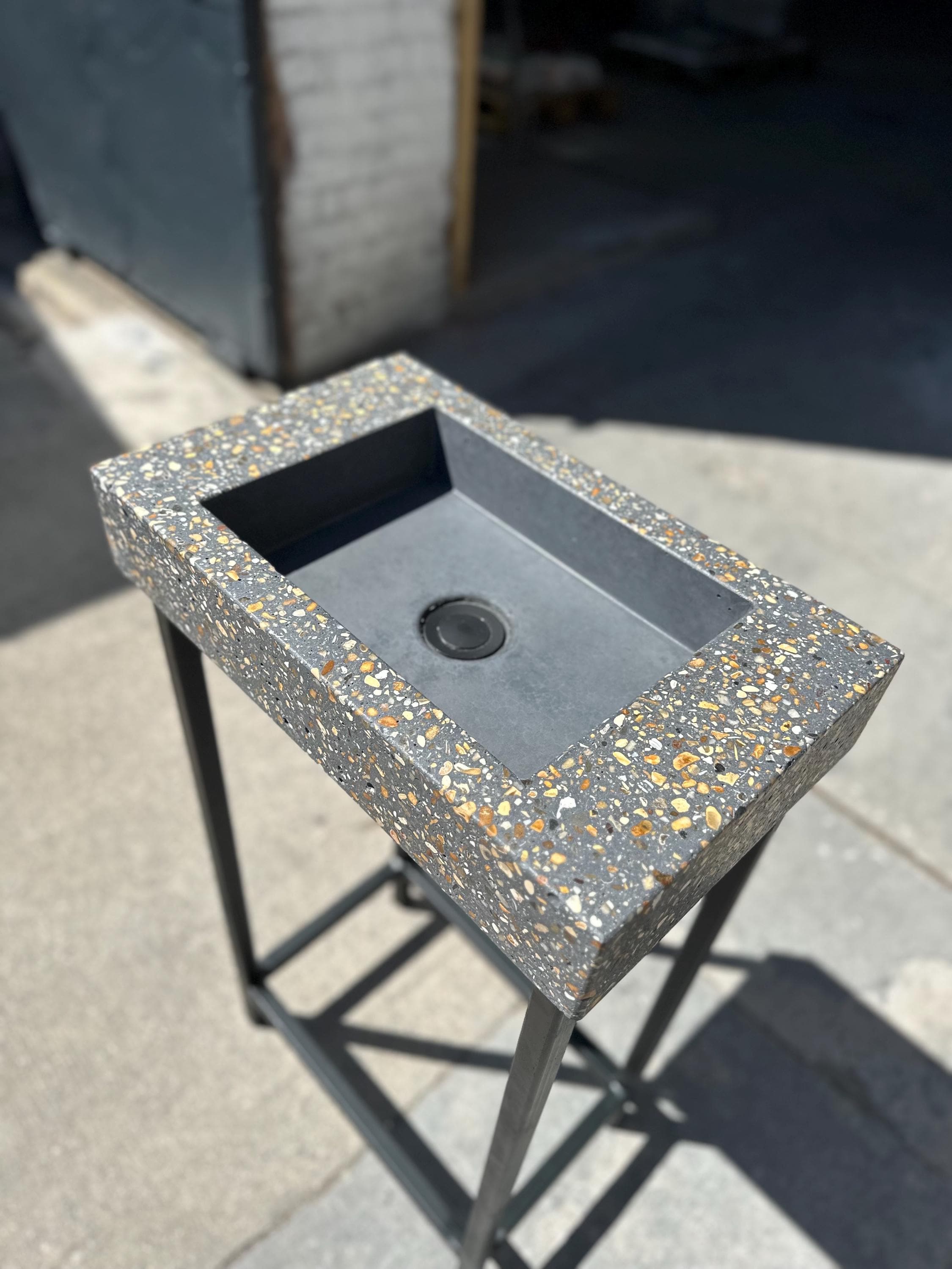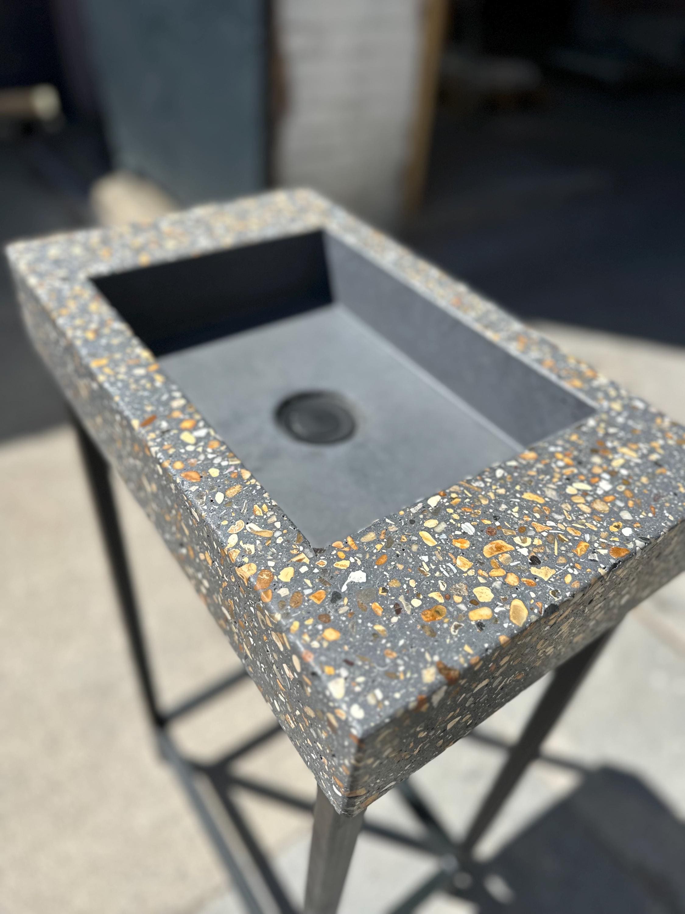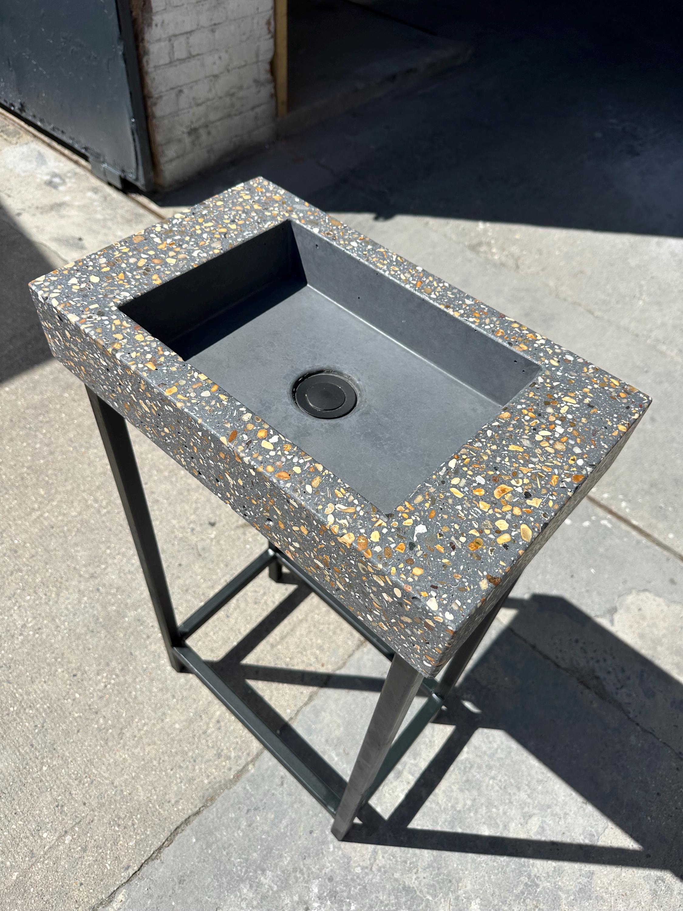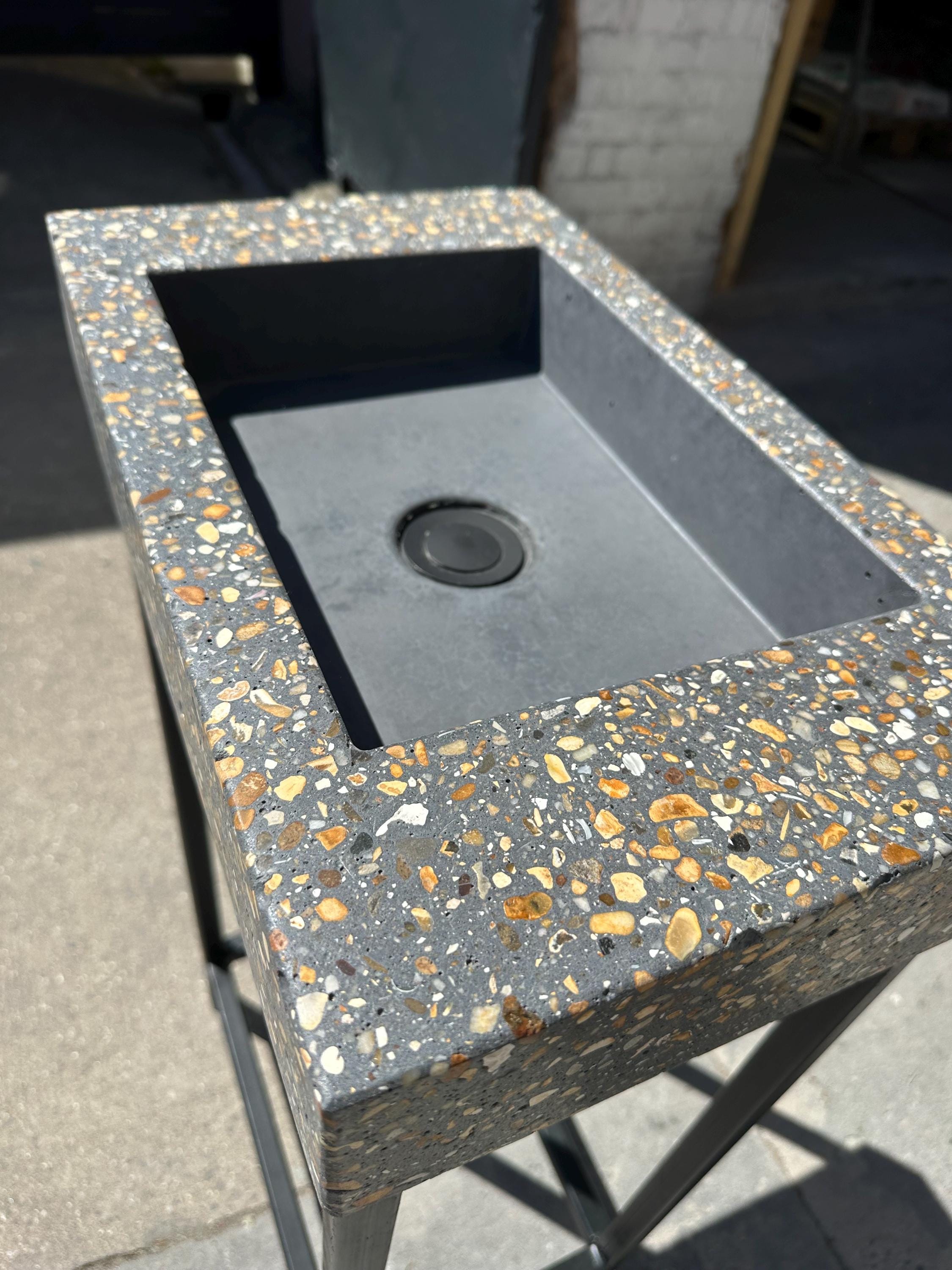Make a bold statement in your bathroom with our handmade black terrazzo concrete sink and frame set, combining luxury design with everyday practicality. The deep black concrete basin is enhanced with natural terrazzo stone chips, creating a striking speckled finish that brings depth, texture, and style to any space.